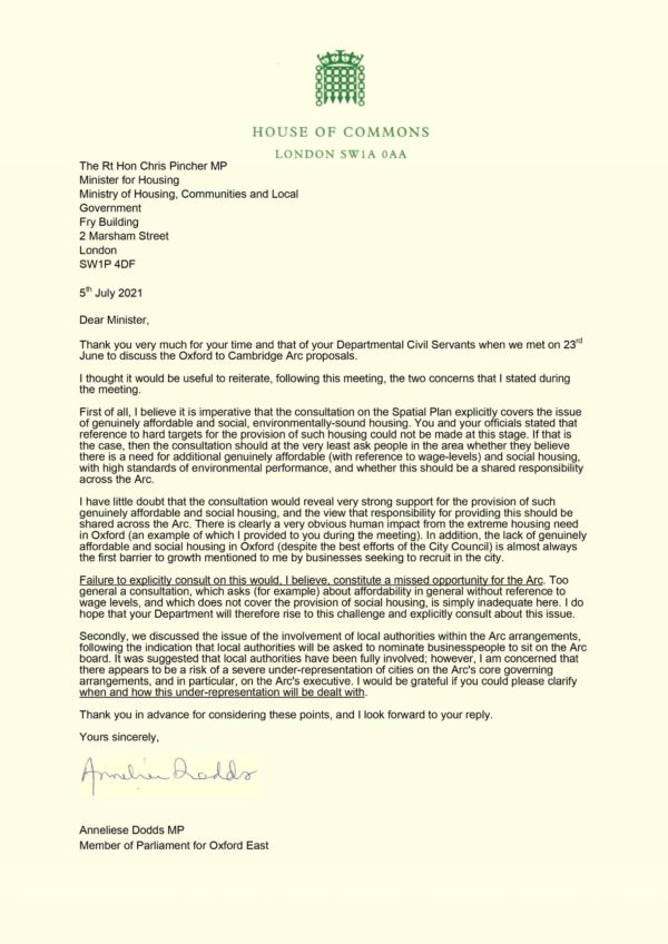Anneliese’s concerns about Ox-Cam Arc are raised in parliament
